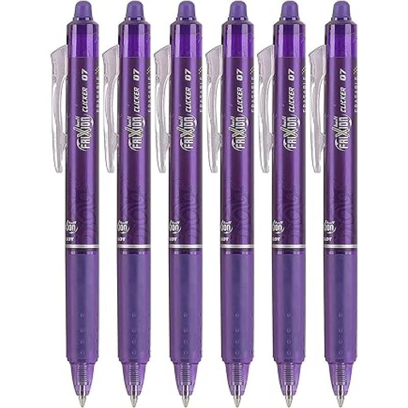 Pilot FriXion Clicker 0.7mm Purple Ink Pack of 6 is a set of retractable erasable gel pens designed for smooth writing and easy corrections. Featuring 0.7 mm fine tips, these pens deliver clean, precise lines with vibrant purple ink, making them perfect for notes, journaling, schoolwork, and office tasks.
